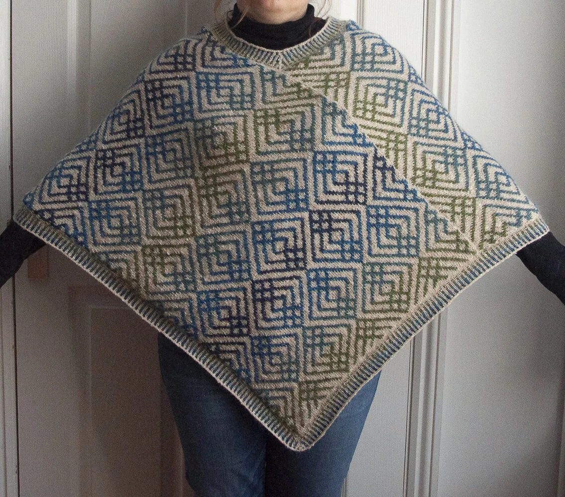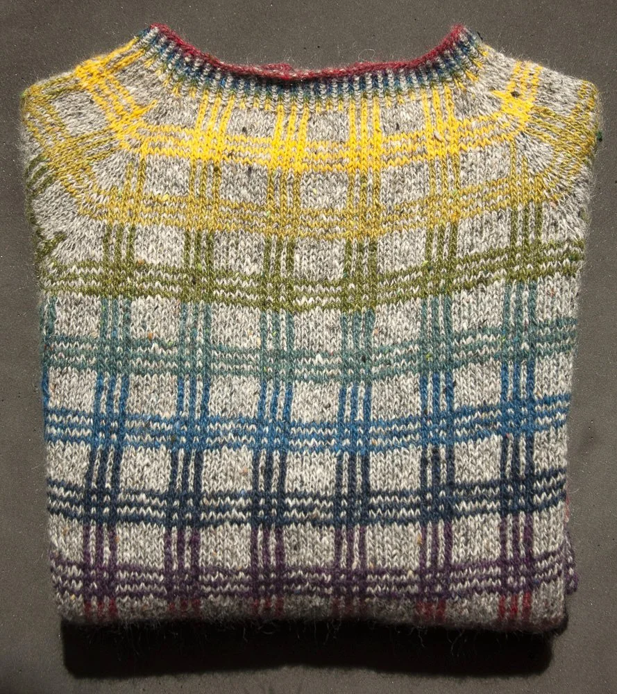 This sweater is based on a triple-square motif, which highlights a beautiful gradient of 8, 9 or 10 shades of Milarrochy Tweed (depending on the size) across a neutral background or vice versa. The Gradient Mesh set of beanie and gauntlets, published in Colour Moves, is featuring a doubled-square motif; in this design, I chose to use a bigger allover repeat.