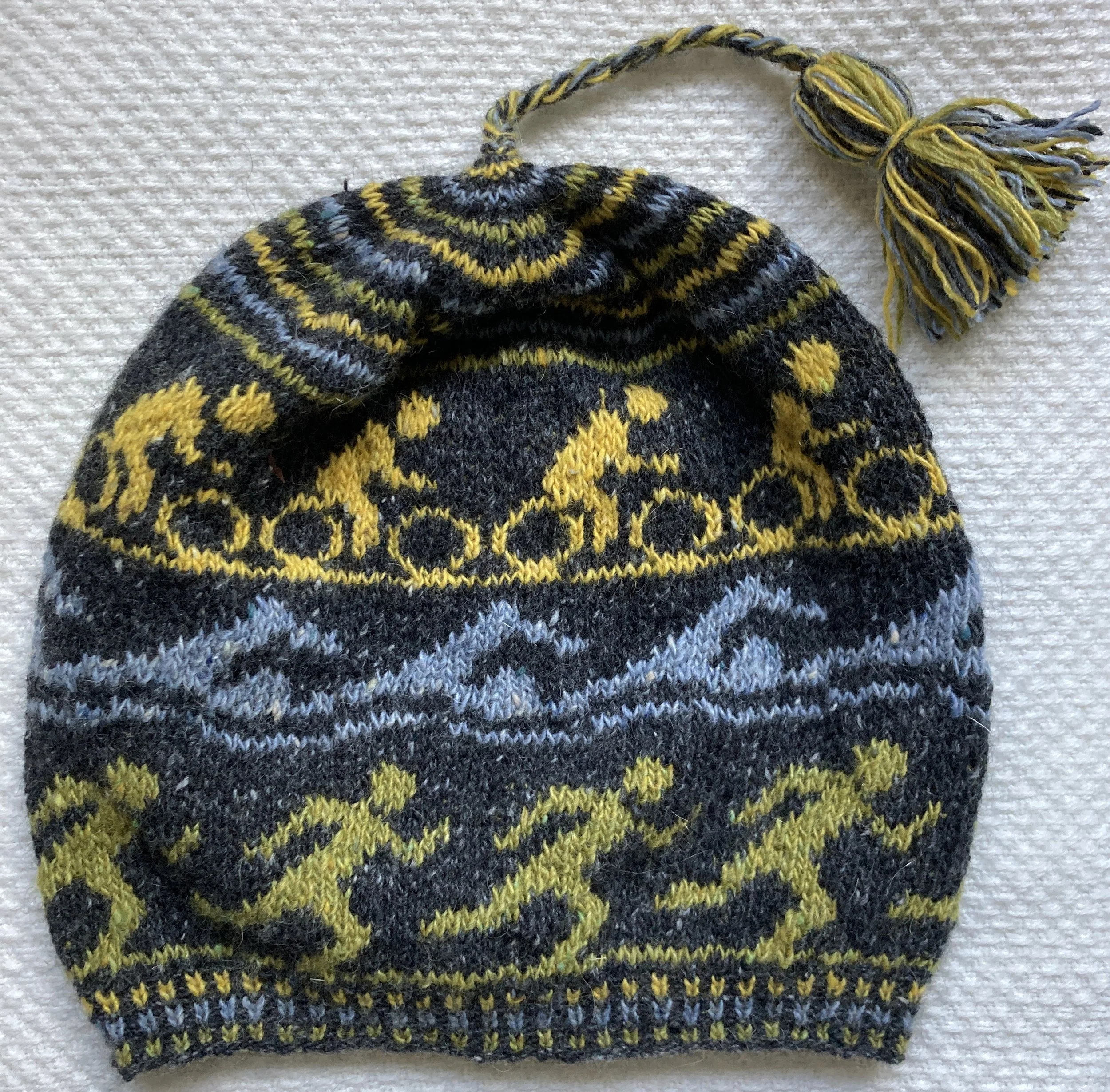 After designing Easing Flow, the idea to knit a slouchy beanie with a triathlon theme came naturally, and that’s how Triathletes pattern was born! I’m not a triathlete, nor an athlete, just an amateur! In 2022 I turned 50, and not only I’ve resumed swimming (indoors and in open waters) but I started to run 5k on Saturday ParkRun. I’m not a regular participant, but I’m enjoying it. Now with bikes, I don’t have an incredible feeling, I used to cycle a bit as a child and teenager, but growing up I always preferred motorbikes/ scooters, which are less tiring, but who knows, maybe in my 60s, I will pick up a bike! These activities led me to meet many lovely people and great athletes that compete in Duathlon and/or Triathlon; the community around the lakes I go swimming, for example, are so supportive and fun people to be around. I wanted to include this experience in one hat that can be worn during waiting time at sports events or on a relaxing day.