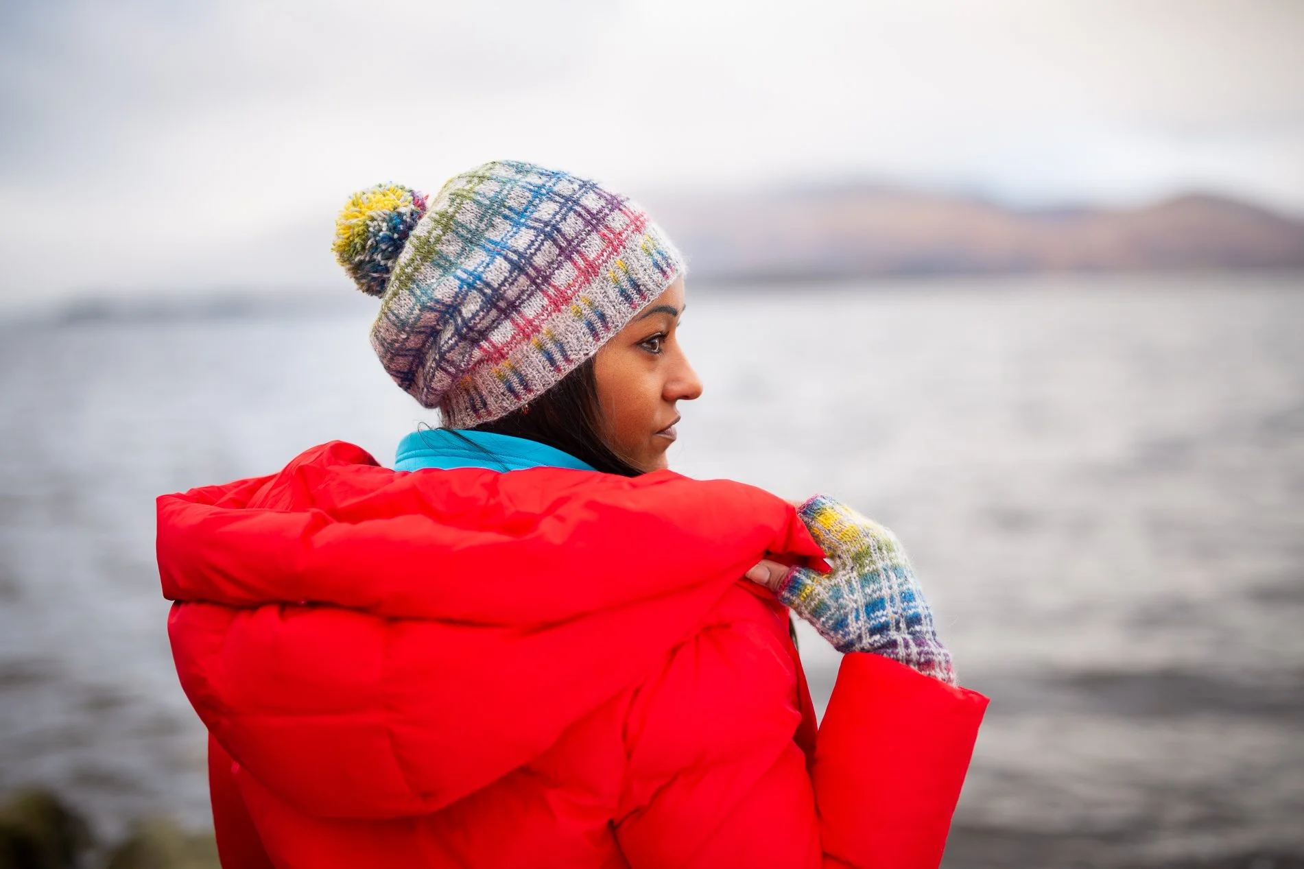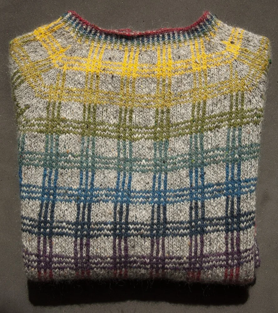 This sweater is a unisex garment and is based on a triple-square motif, which highlights a beautiful gradient of 8, 9 or 10 shades of Milarrochy Tweed (depending on the size) across a neutral background or vice versa. The Gradient Mesh set of beanie and gauntlets, published in Colour Moves, is featuring a doubled-square motif; in this design, I chose to use a bigger allover repeat. I was very fond of the result of the Gradient Mesh set of beanie and gauntlets and that’s why I wanted a matching sweater!
